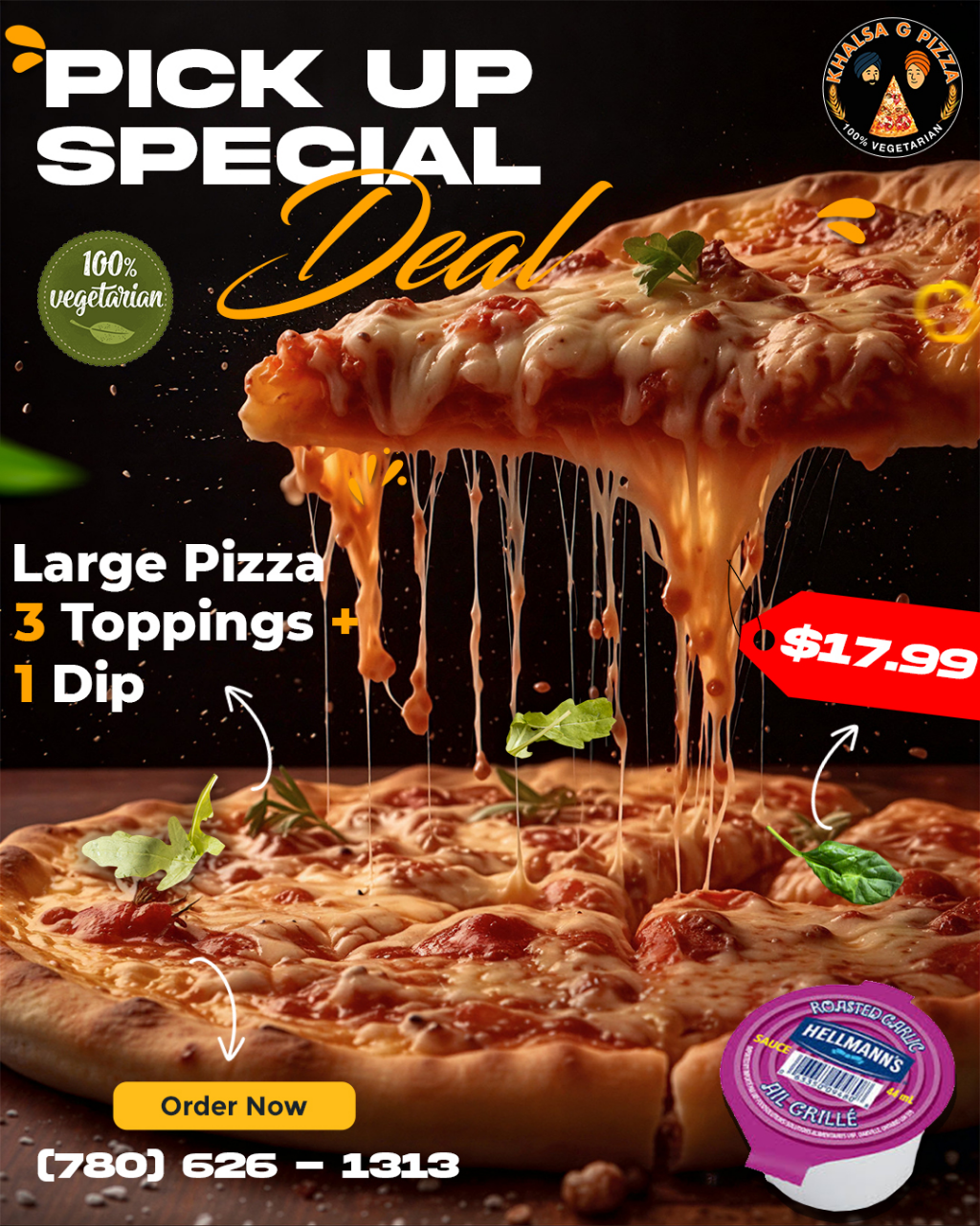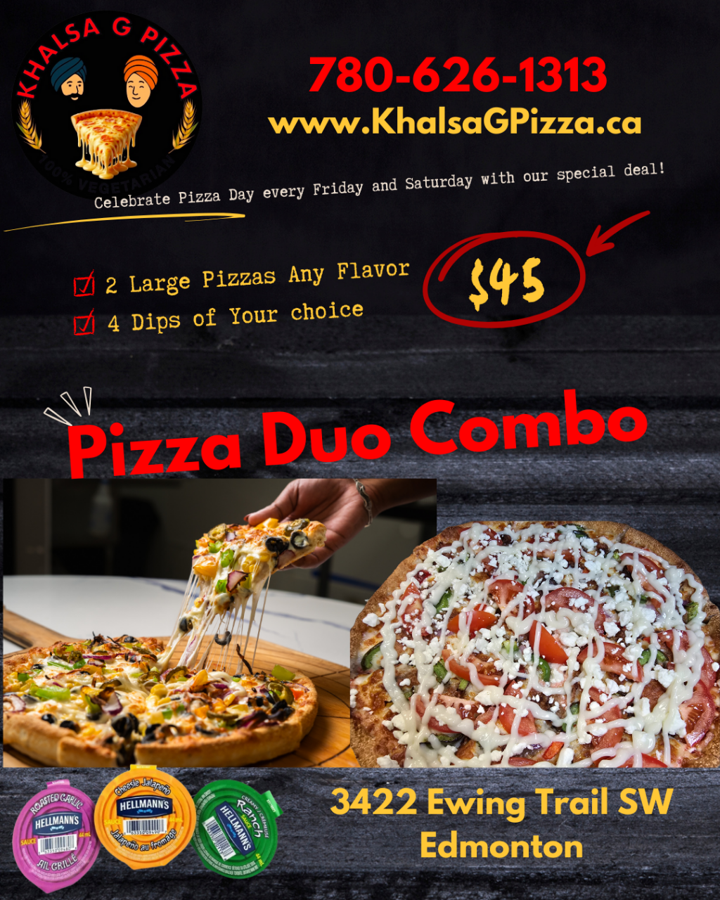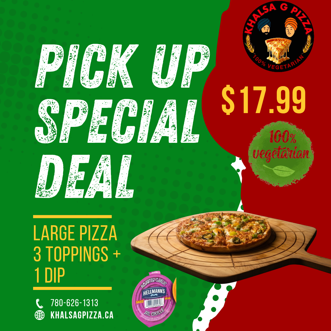Khalsa G Pizza, located at 3422 Ewing Trail, Unit 403, Edmonton, is a proudly vegetarian pizza store that brings together rich flavors, high-quality ingredients, and a passion for great food.